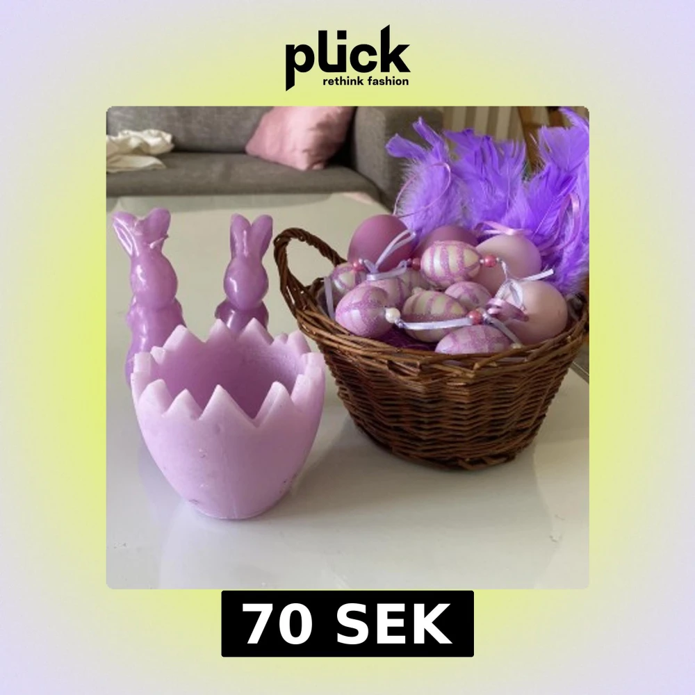 Charmiga påskdekorationer i lila, inklusive två kaninformade ljus, en korg med fjädrar och dekorerade ägg samt en äggformad ljushållare. Perfekt för att skapa en festlig stämning under påsken. Tillbehören är ej använda, fjädrarna är helt nya. Pris kan diskuteras!