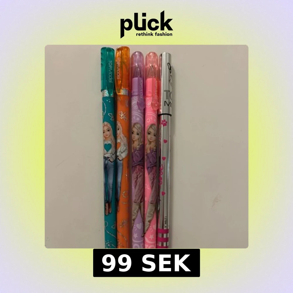 Fem färgglada Top Model pennor med olika motiv och mönster. Färgerna på pennorna är orange, grön, lila, rosa och silver. Pennorna är i fint skick.