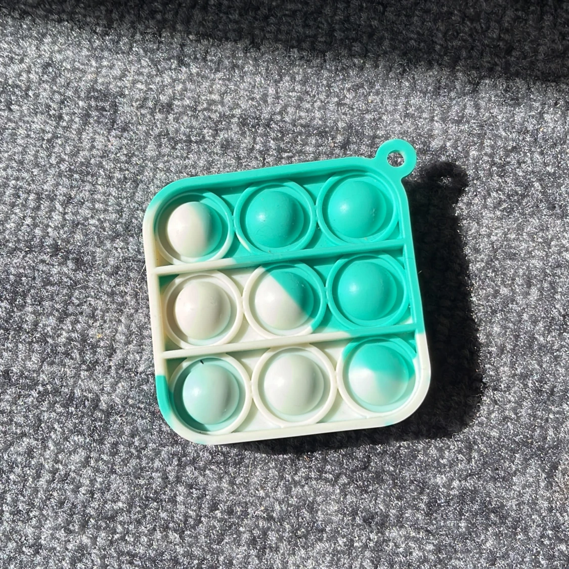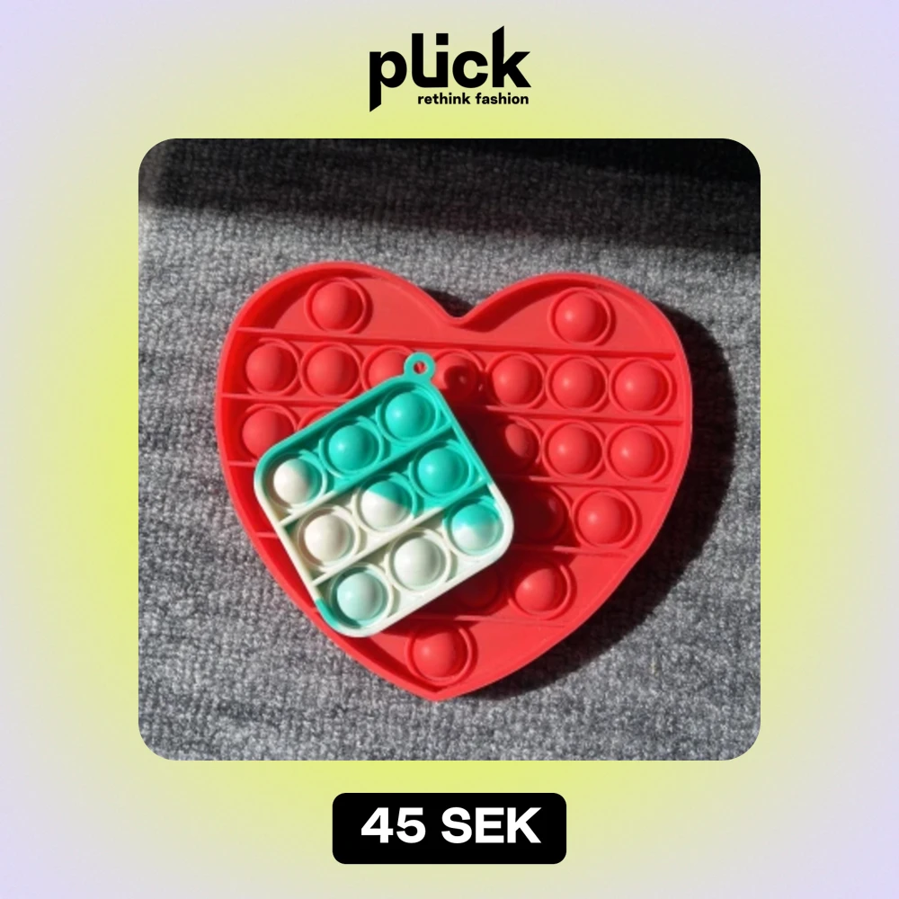 2st Pop Its som säljs tillsammans. Den lilla kan man hänga på nyckeln. Form: En liten fyrkantig grön/blå & vit pop it. En stor hjärtformad röd/rosa pop it.