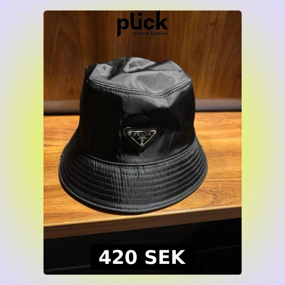 Snygg svart bucket hat från Prada med ikonisk metalltriangel framtill. Hatten är tillverkad i ett glansigt syntetmaterial som ger en lyxig känsla. Perfekt accessoar för att lyfta din stil och ge en modern touch till din outfit. Hatten är aldrig använd! Tveka inte att höra av er vid frågor eller funderingar🤗