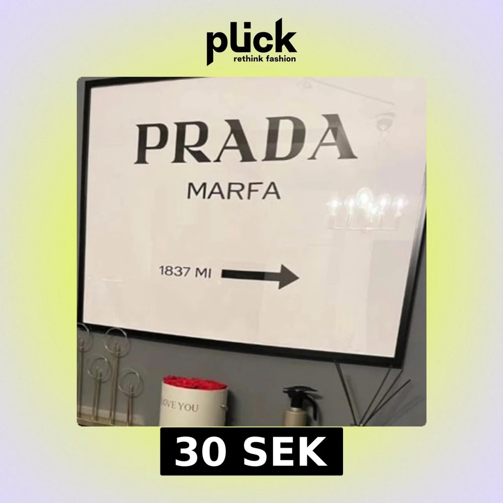 Stilren poster med texten 'PRADA MARFA' och en pil som visar avståndet 1837 miles. Perfekt för dig som gillar mode och vill ge ditt rum en trendig och modern känsla. Passar utmärkt som inredningsdetalj för unga vuxna och modeintresserade. Har 2 st, en oanvänd i förpackning och en som hänger. Den förpackade skickas.