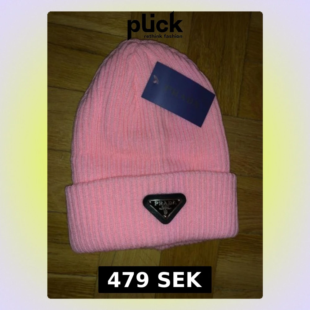 Säljer en snygg rosa mössa från Prada med ribbstickad design och uppvikt kant. Mössan har en metallbricka med Prada-loggan framtill som ger en lyxig touch. Perfekt accessoar för att lyfta din vinterstil.