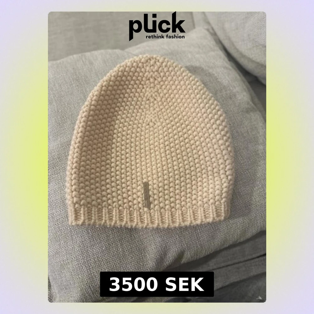 Säljer en chunky stickad mössa från Prada i en snygg beige färg. Mössan är gjord i 100% ull och har en liten metallbricka med Prada-loggan framtill. Perfekt accessoar för kalla dagar och riktigt trendig look.