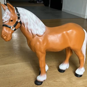 Prydnadshäst/leksakshäst i plast modell större. Ca 40 cm hög och 40 cm lång. Relativt lätt pga ihålig. Älskad men i mkt gott skick, ser inga repor eller liknande