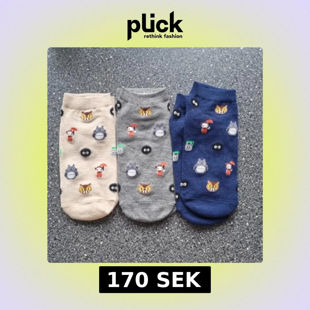Säljer ett set med tre par Totoro ankelstrumpor i beige, grå och blå. Varje par har ett lekfullt mönster med olika karaktärer i glada färger. Perfekta för att ge en rolig touch till din vardagsstil! Storlek EU: 35-40