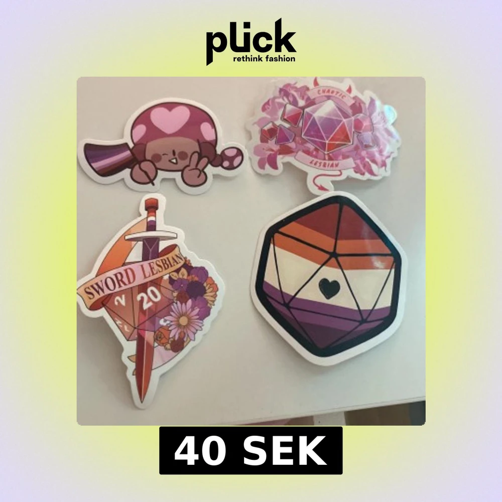 Ett färgglatt set med fyra klistermärken med DnD- och nördtema, alla med lesbiska motiv och flaggor. Perfekt för att dekorera laptops, anteckningsböcker eller vattenflaskor och visa din stolthet på ett lekfullt sätt.