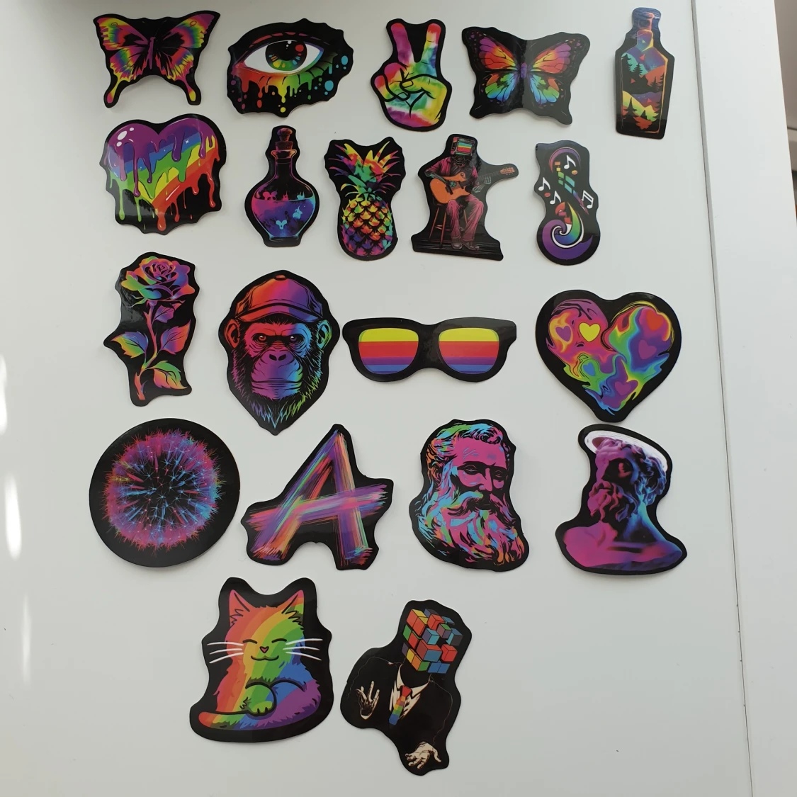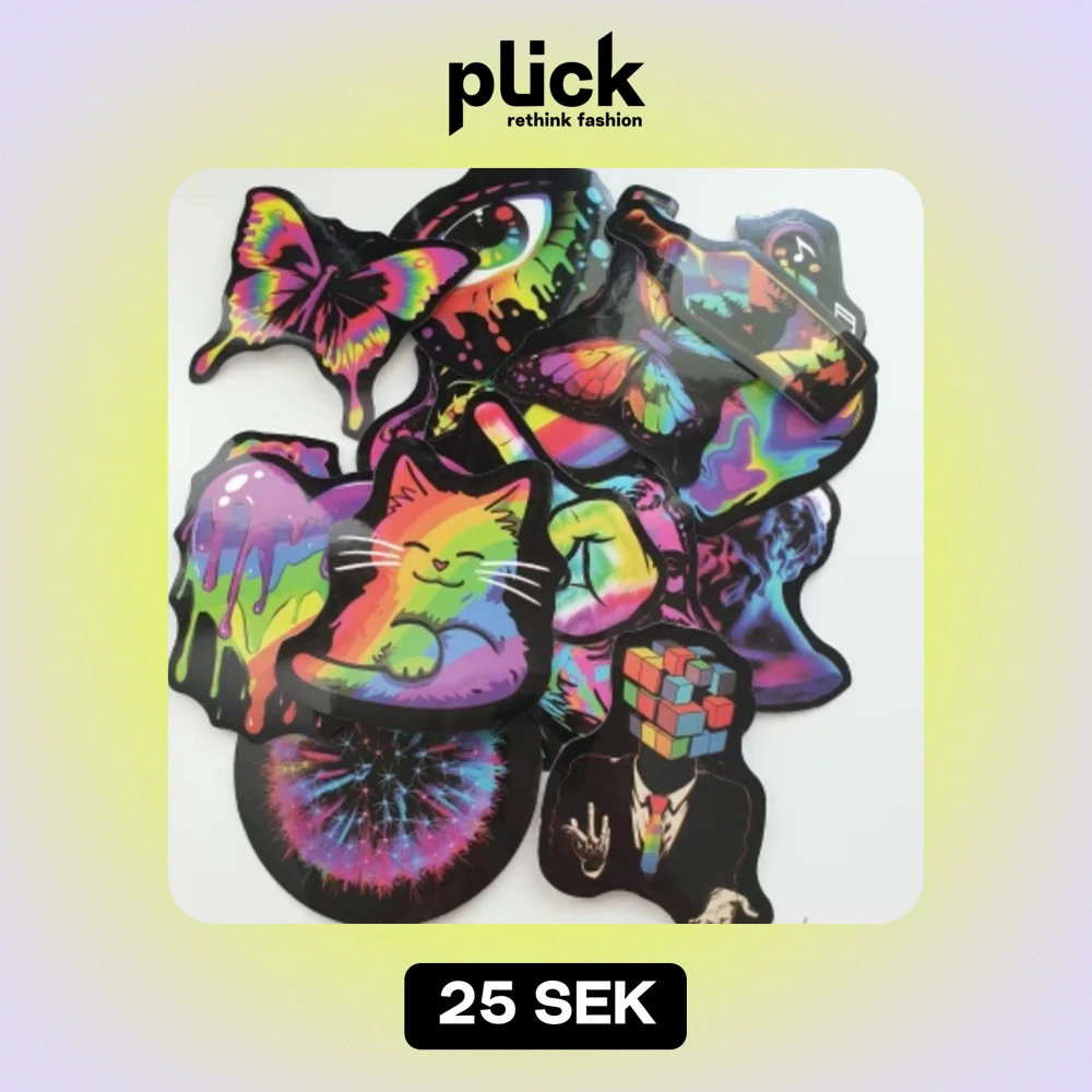 Klistermärken/stickers Motiv: regnbågsfärgad, djur, människor, saker Antal: 20st, Skick: ny/oanvänd Kul att använda till pyssel, scrapbooking och annat. Kan tex användas till att dekorera din bärbara dator, skateboard, resväska, etc.
