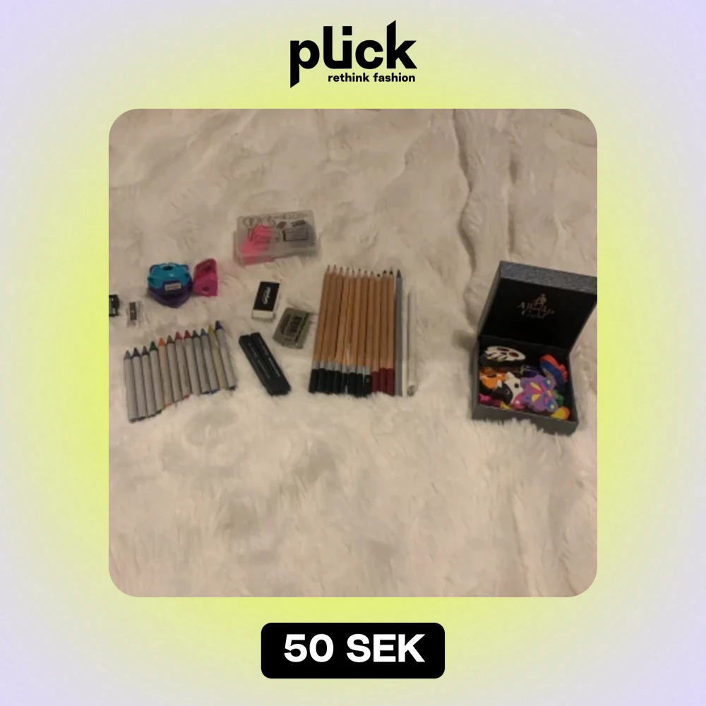 Oanvända jätte bra skiss och målar pennor och suddgummi. Man får 12 färgpennor i olika pastellfärger,12 superbra skiss pennor, 14 roliga suddgummi,2 roliga pennvässare och 2 Professionella pennvässare, två jätte bra suddgummin, och kållPennor.