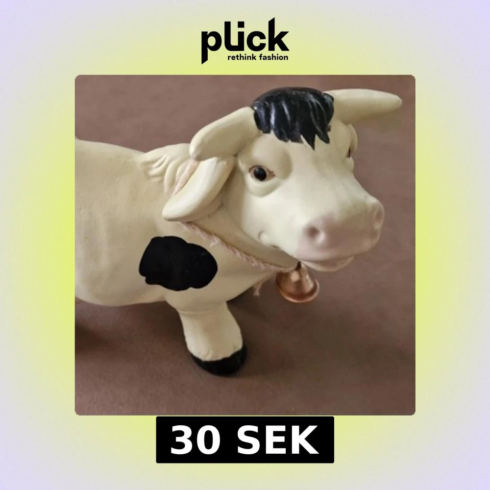 Bilderna visar en dekorativ kofigur i keramik, målad i vitt med svarta fläckar och detaljer. Den har en liten bjällra runt halsen. Produkten har vissa små färgavskrap och märken, men är i överlag gott skick. Perfekt som prydnad eller samlarobjekt. Längd ca 18 cm och höjd ca 14 cm.