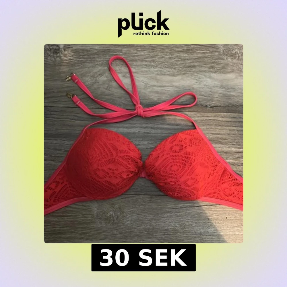 Snygg korallfärgad bikiniöverdel med vadderade kupor och spetsmönster. Knytband i nacken med guldfärgade detaljer på banden. Push up kupor. S/M
