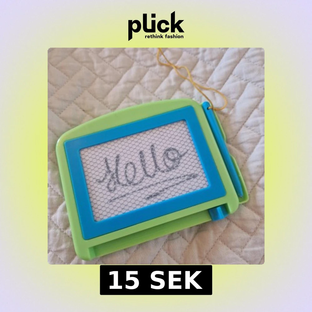 Smidig liten magnetisk ritplatta i grönt och blått med tillhörande penna. Perfekt för barn att rita och sudda om och om igen. Pennan är fäst med snöre, men har lite slitage runt spetsen men inget som hindrar användningen av den. Plattan fungerar som den ska och är i gott begagnat skick.