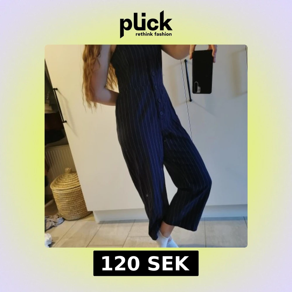 Snygg mörkblå Jump suit från Monki med vita ränder och knappar framtill. Den har smala axelband och en rak passform som ger en stilren look. Perfekt för en avslappnad men ändå chic stil. Axelbanden kan ställas in och göras längre eller kortare. Längd på hela jumpsuiten: 123cm. Ursäkta min skitiga spegel.