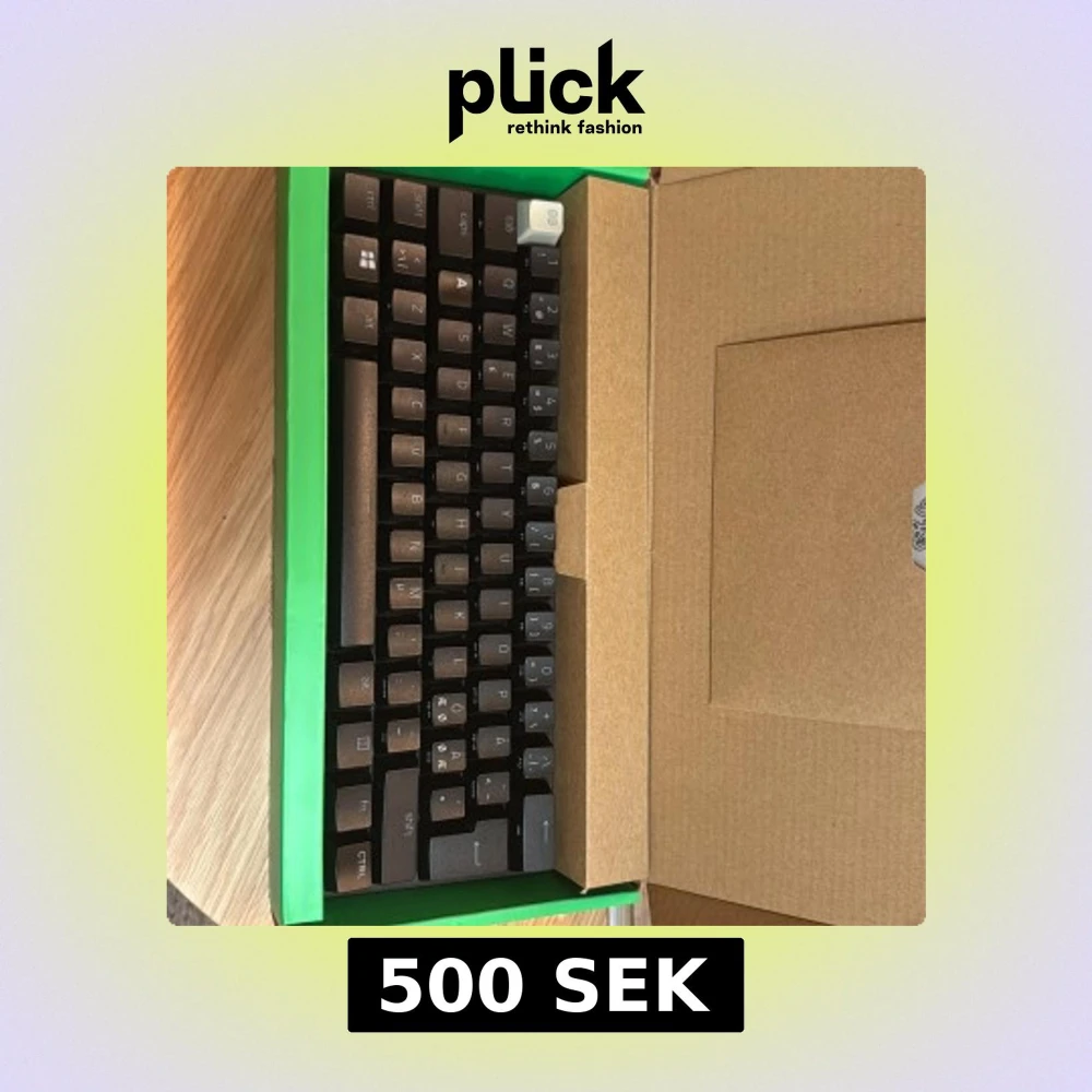 Följer med sladd, klistermärken och instruktionsbok. Det är lila clicky optimal switches