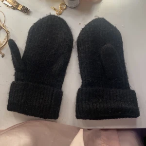 Säljer ett par svarta stickade vantar som är perfekta för kalla dagar. De har en enkel design med ribbstickade muddar för extra värme och komfort. Passar bra till vinteroutfits och håller händerna varma och mysiga. Perfekt för dig som vill ha stil och funktion i ett!