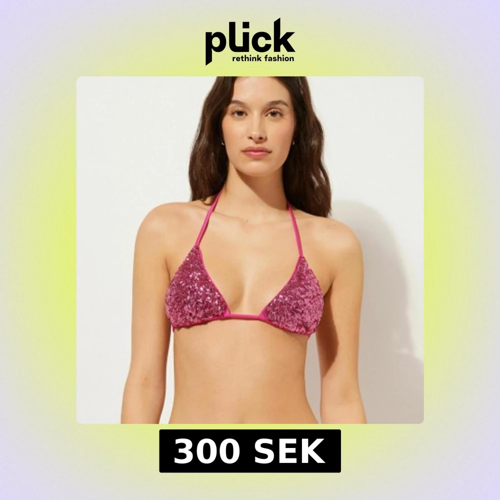 Supersnygg trekantsbikini i stark rosa med glittrande paljetter. Klassisk modell med tunna band som knyts i nacken och ryggen. Säljer den pga att den är för liten och helt oanvänd. Säljs inte i Sverige
