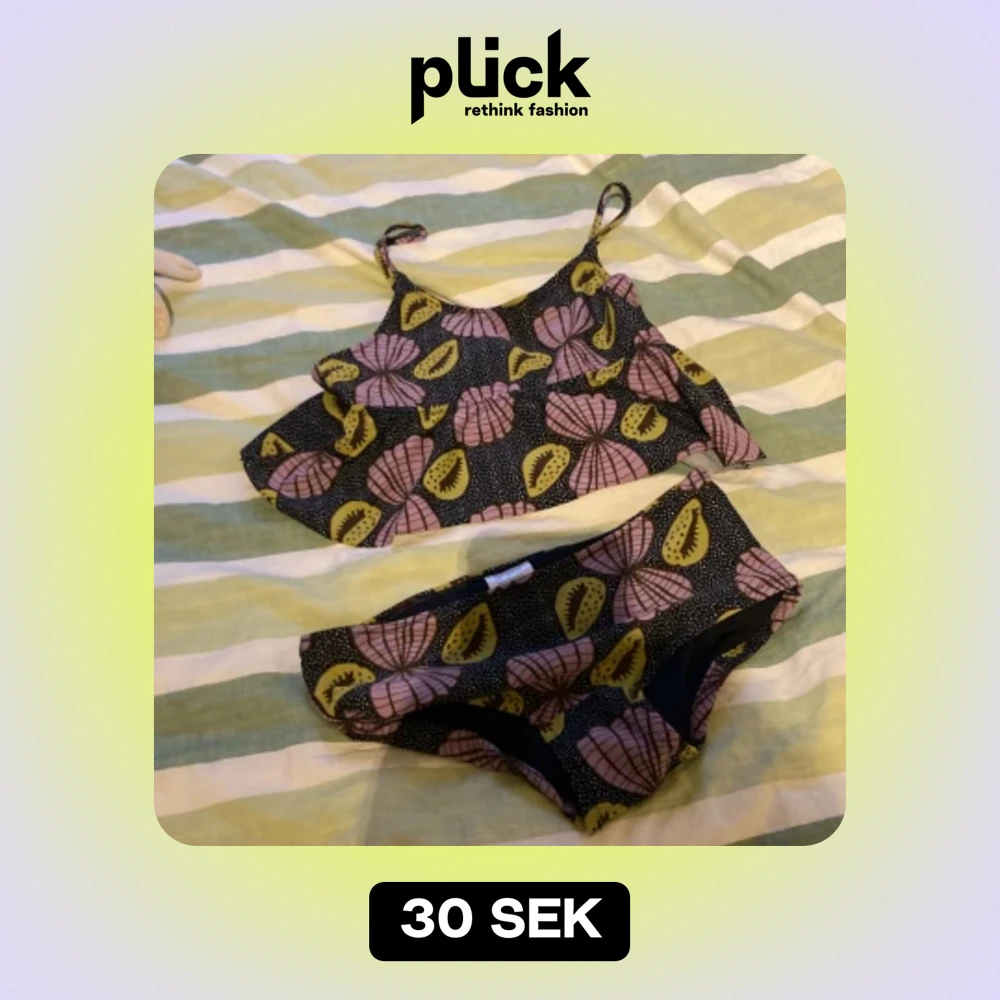 Säljer en superfin bikini från Lindex i storlek 146/152 (10-12 år). Bikinin har ett coolt mönster med blommor i rosa och gula nyanser på en svart bakgrund. Toppen har smala axelband och en volangdetalj som gör den extra söt. Perfekt för sommarens bad och strandhäng!