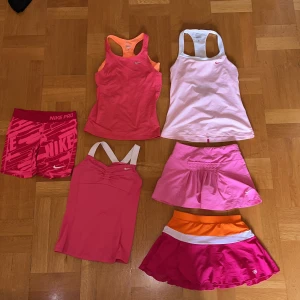 2 linnen, 2 kjolar med undershorts, en klänning. Storlek xs/barnstorlek. Säljs allt tillsammans. Allt är från nike förutom det rosa/orangea kjolen som är ifrån wilson. Rosa nikeshorts och rosa nikelinne är borta och säljs inte!!