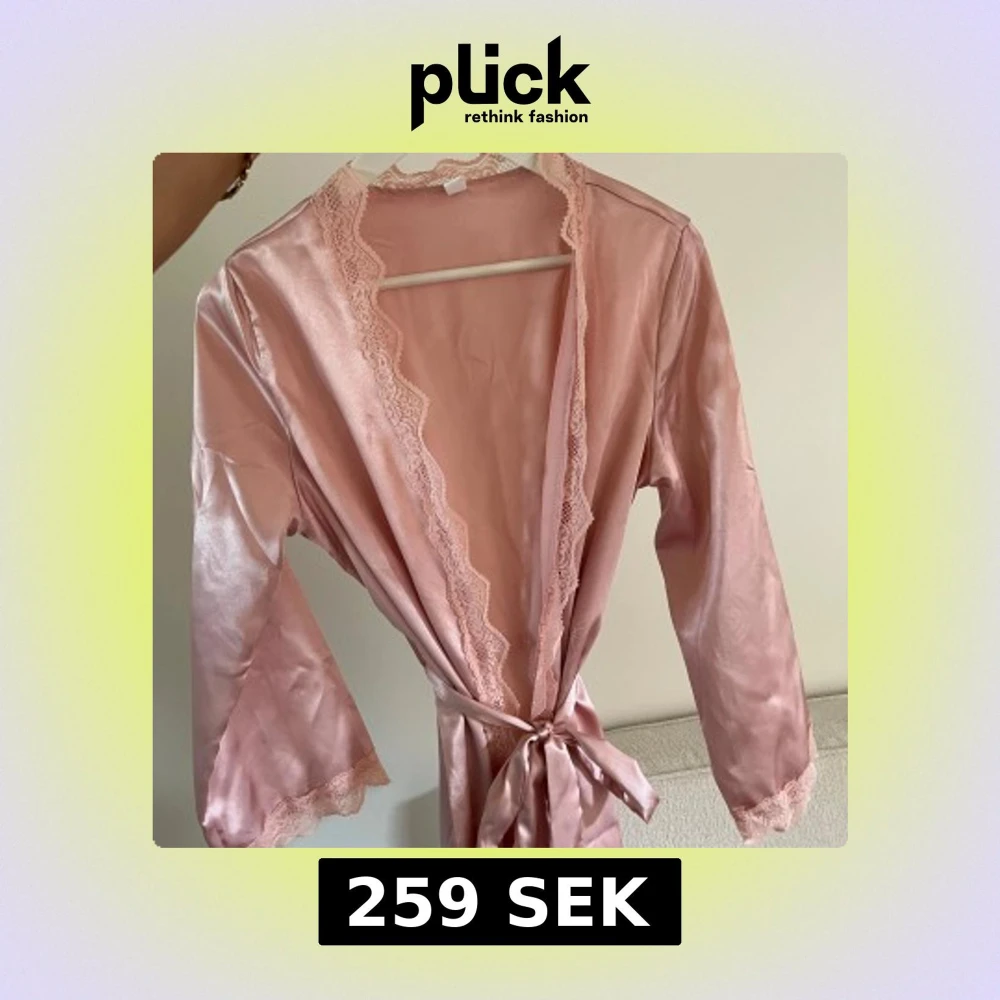Säljer en ljusrosa morgonrock i satin med fina spetsdetaljer längs kanterna och ärmsluten. Rocken har trekvartsärm och knyts i midjan med ett matchande bälte. Perfekt för en lyxig känsla hemma.