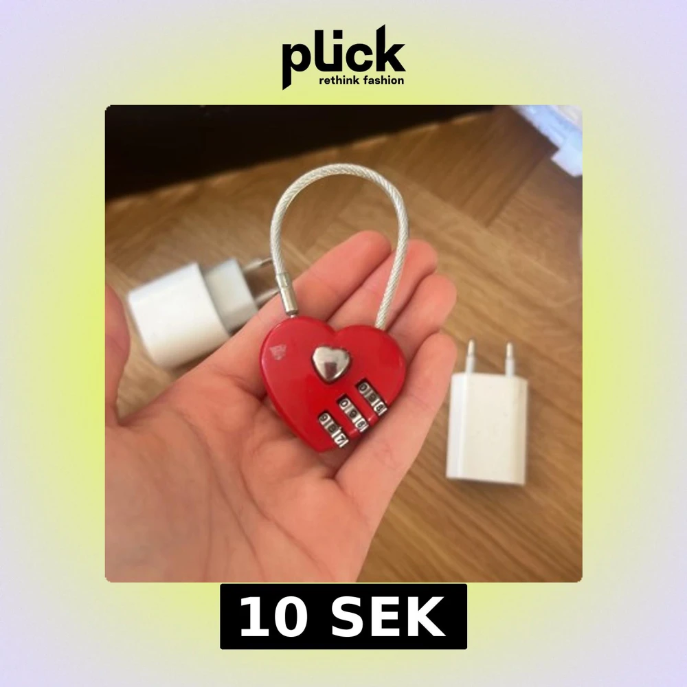 Säljer ett rött hjärtformat kodlås med silverfärgad vajer och detaljer. Perfekt accessoar för att låsa väskan eller skåpet och samtidigt visa lite kärlek. Låset har tre kodhjul och en liten silverhjärta i mitten.