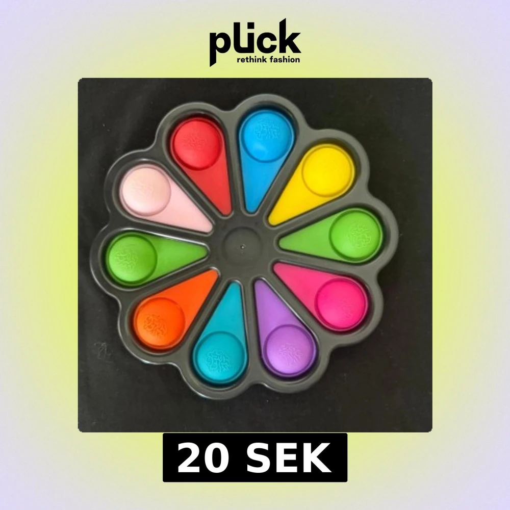 En rund svart pop it med olika färger på den. Exempel röd, lila, rosa, grön, gul och så vidare.