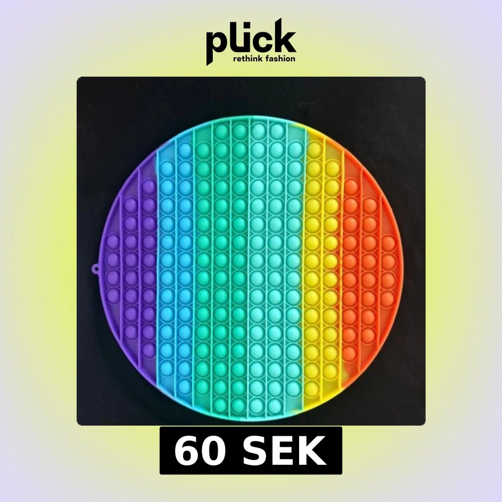 Säljer en stor rund pop it-leksak i regnbågens färger. Den har bubblor att trycka på och är perfekt för att stressa ner eller bara ha kul. Färgerna går i lila, blå, grön, gul, orange och röd. Gjord i mjuk silikon och lätt att ta med sig.