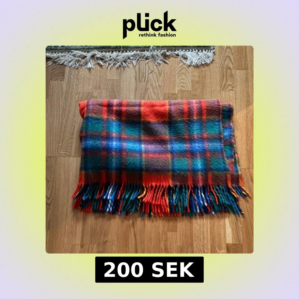 Säljer en färgglad rutig filt med fransar i ändarna. Filten har en mix av rött, blått, grönt och orange i ett klassiskt rutmönster.