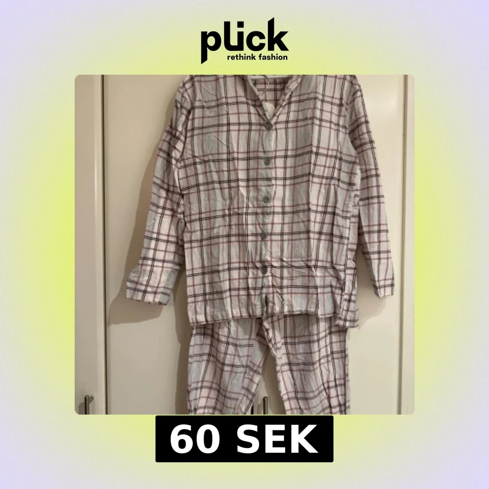 Mysig tvådelad pyjamas från Åhléns i storlek S. Setet är vitt med rosa- och rödrurigt mönster, har skjortkrage, knappar framtill och elastisk midja på byxorna.