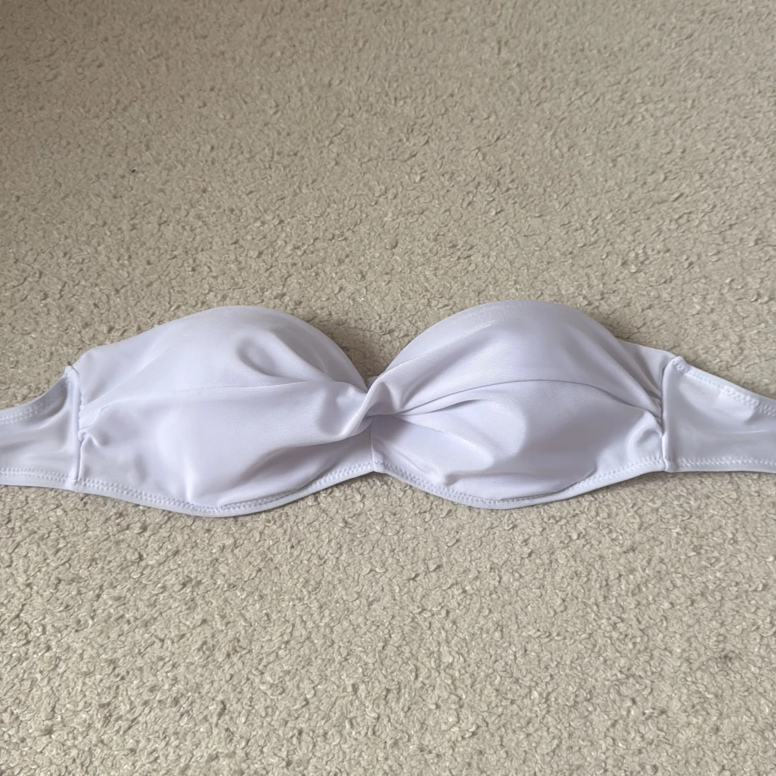 Snygg vit bandeau bikiniöverdel med twistad detalj framtill. Stilren och enkel design som passar perfekt till stranden eller poolen. Materialet är mjukt och följsamt syntet för skön komfort. Perfekt för dig som gillar minimalistisk stil.