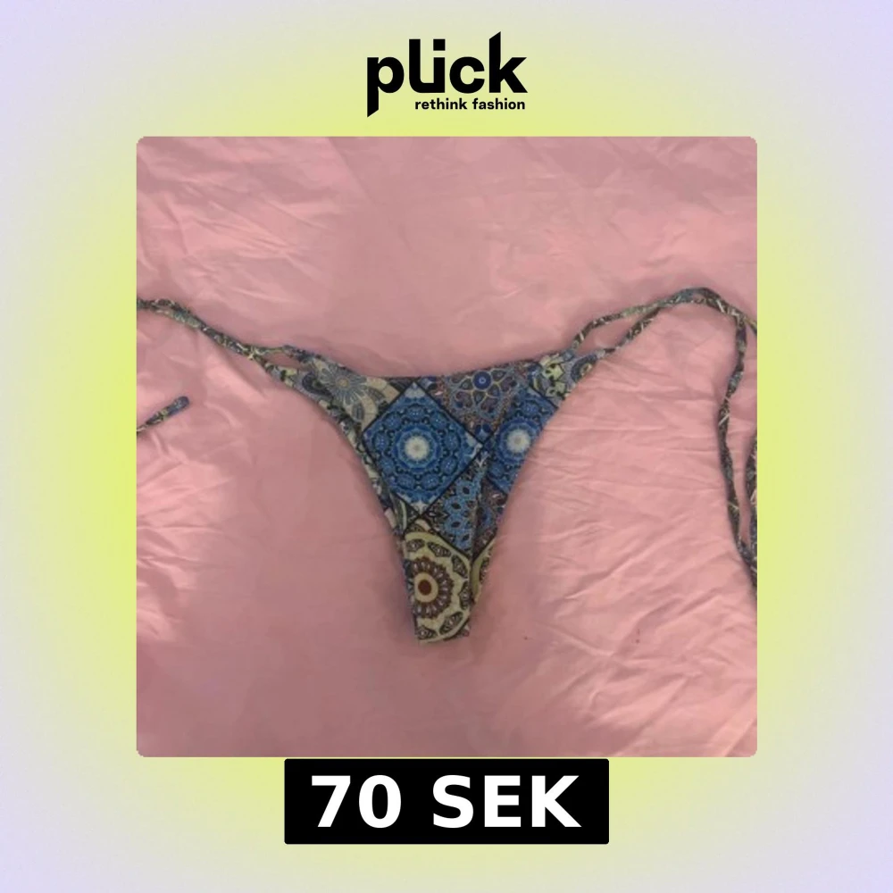 Säljer en snygg bikiniunderdel med blått och beige mönster i boho-stil. Modellen har högt skurna ben och smala knytband i sidorna för en justerbar passform. Perfekt för strandhäng och soliga dagar.