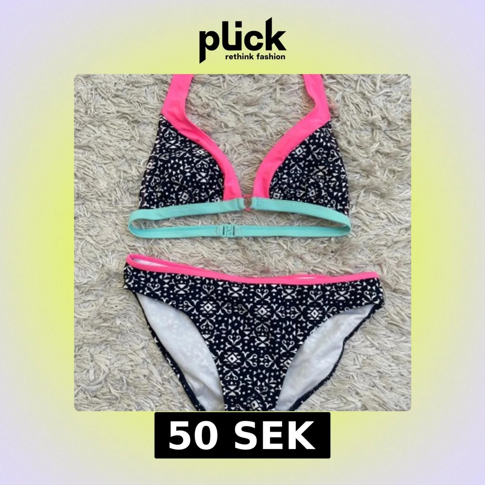 Snygg oanvänd bikini från Yigga med svartvitt grafiskt mönster och detaljer i neonrosa och mintgrönt. Överdelen har triangelformade kupor och spänne i ryggen. Storleken skulle jag säga är runt en S