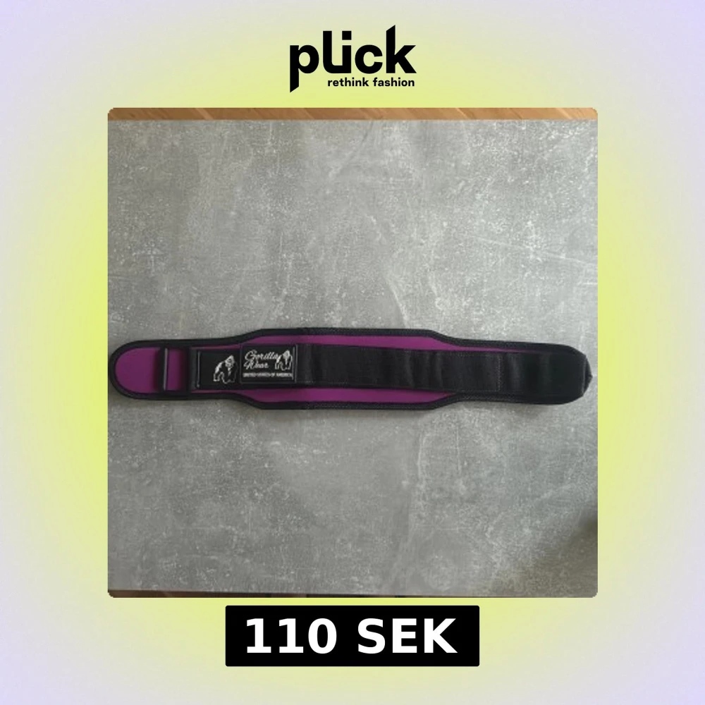 Säljer ett brett träningsbälte från Gorilla Wear i svart och lila med justerbart kardborrespänne. Bältet har en tydlig logga med gorilla och texten 'I DARE YOU' på insidan. Perfekt för gymmet när du vill ha extra stöd vid tunga lyft.