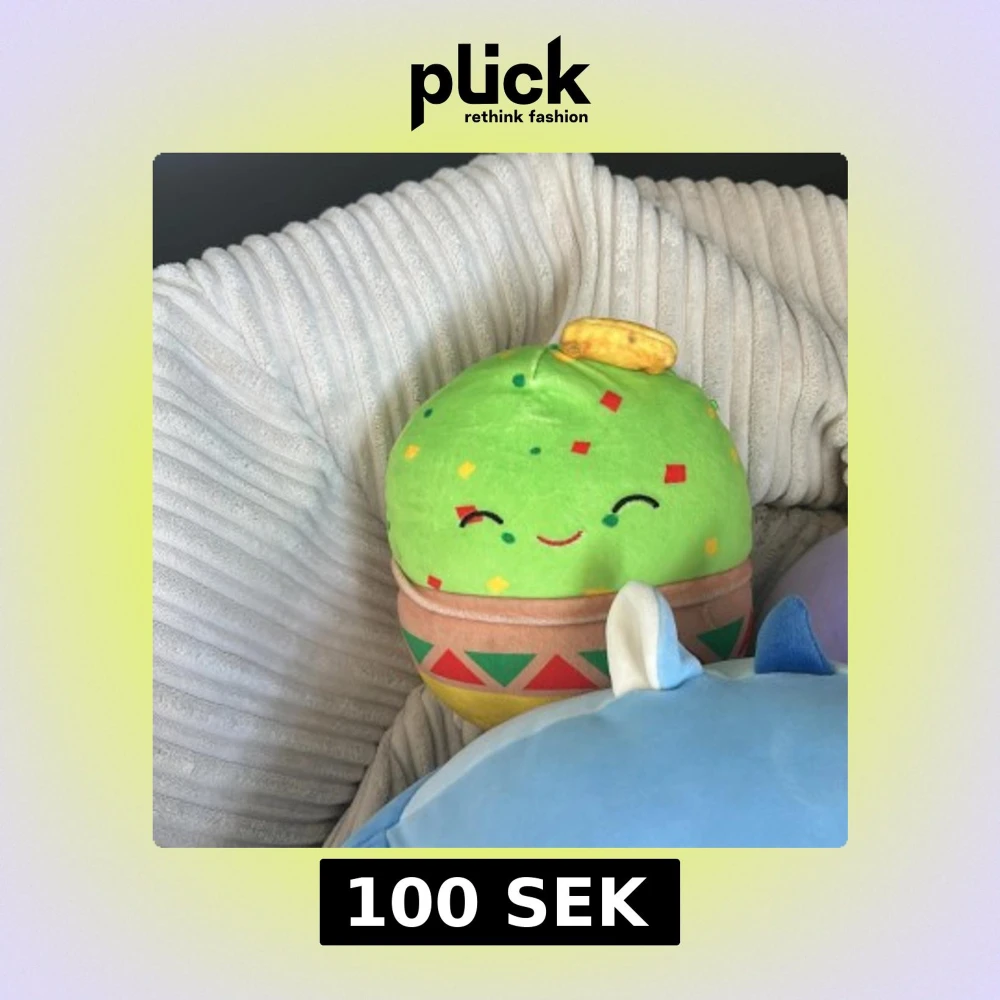 Supermjuk och färgglad Squishmallows i form av en guacamole med tortilla-chip på huvudet. Gosedjuret har glada ansiktsdrag, grönt, gult och rött mönster och är perfekt för att mysa med eller samla på.