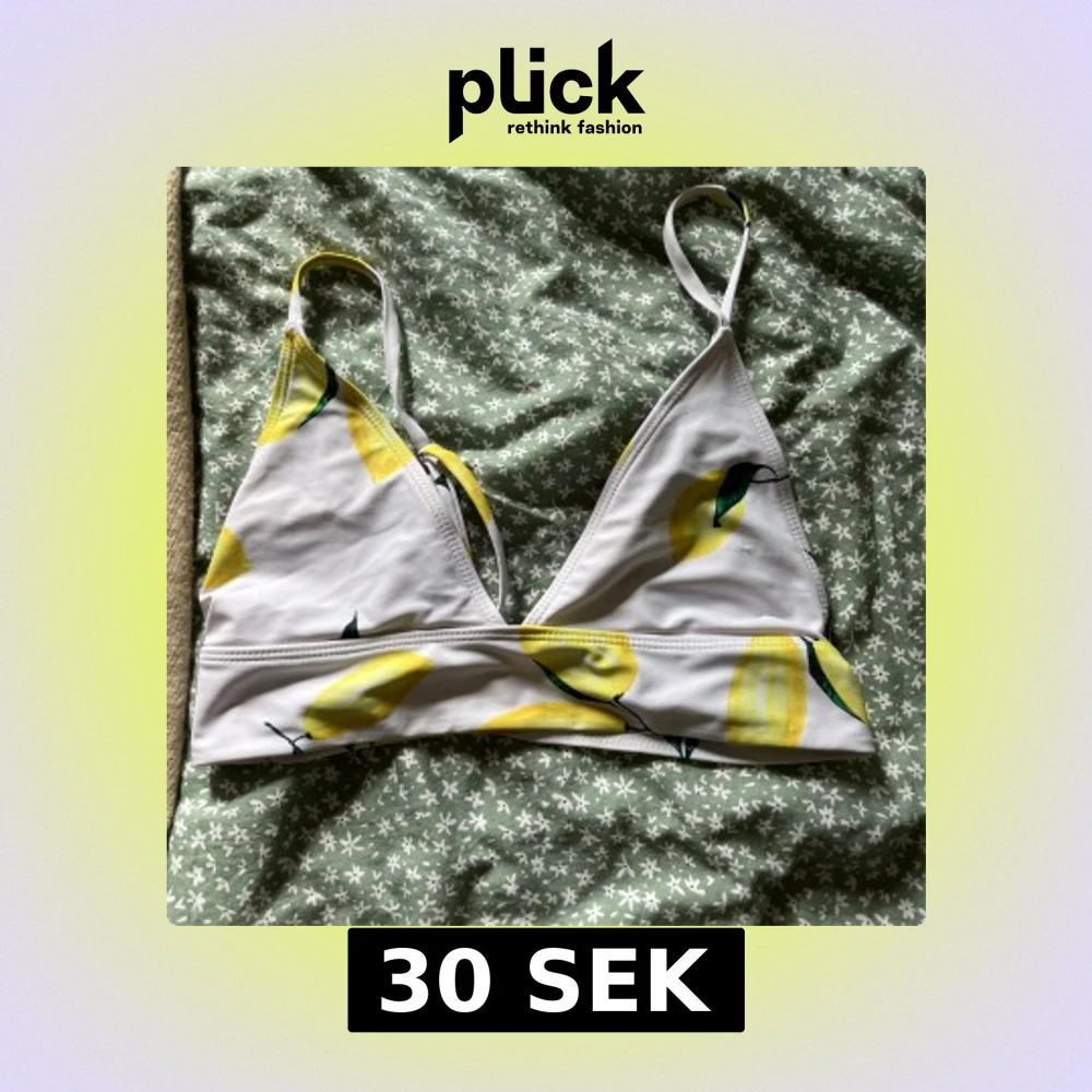 Superfin bikiniöverdel i vitt med stora gula citroner som print. Triangelmodell med smala axelband och enkel design, perfekt för stranden eller poolen. Snygg och fräsch look som sticker ut i sommarvärmen.