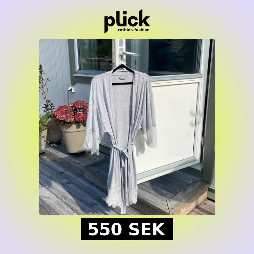 Superfin ljusgrå morgonrock med knytband i midjan och vacker spetsdetaljer vid ärmslut och nederkant. Morgonrocken har trekvartsärmar och är tillverkad i mjukt, tunt material som känns skönt mot huden. Perfekt för en chill och avslappnad look.