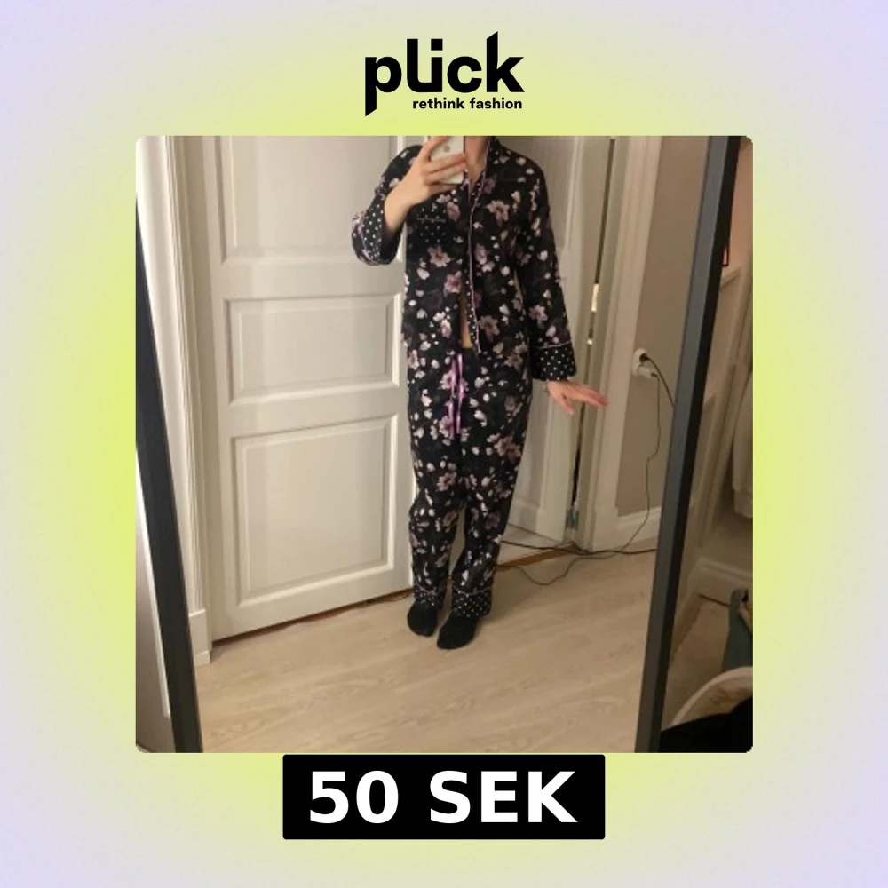 Säljer ett par svarta pyjamasbyxor med lila och vita blommor, samt prickiga detaljer vid benslut och midja samt tröja gjort av silk . Byxorna har en avslappnad passform och snörning i midjan med lila band. Materialet är mjukt och glansigt, perfekt för chillkvällar.
