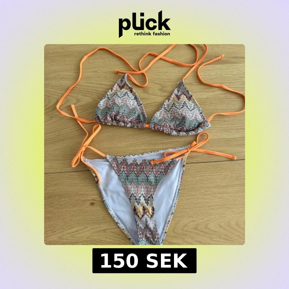 Snygg bikini med färgglatt mönster i rosa, grön, gul och grå toner. Triangeltopp och trosa med knyt i sidorna och tunna orange snören. Perfekt för stranden eller poolen, ger en fräsch och trendig look.