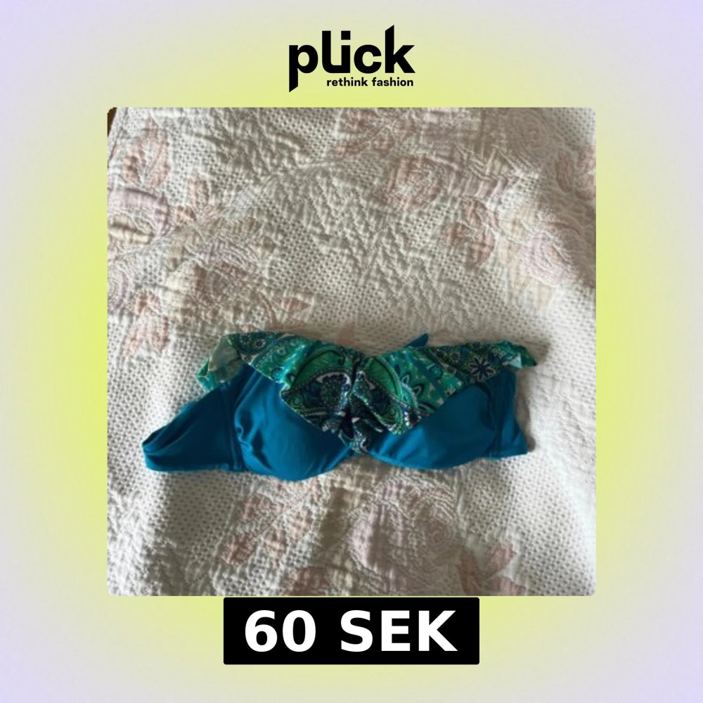 Snygg turkos bikiniöverdel från Tezenis med paisley-inspirerat mönster i grönt och blått på volangen. Bandeau-modell med avtagbar axelrem i samma mönster. Perfekt för strandhäng och poolparty! Materialet är mjuk och stretchig polyester.