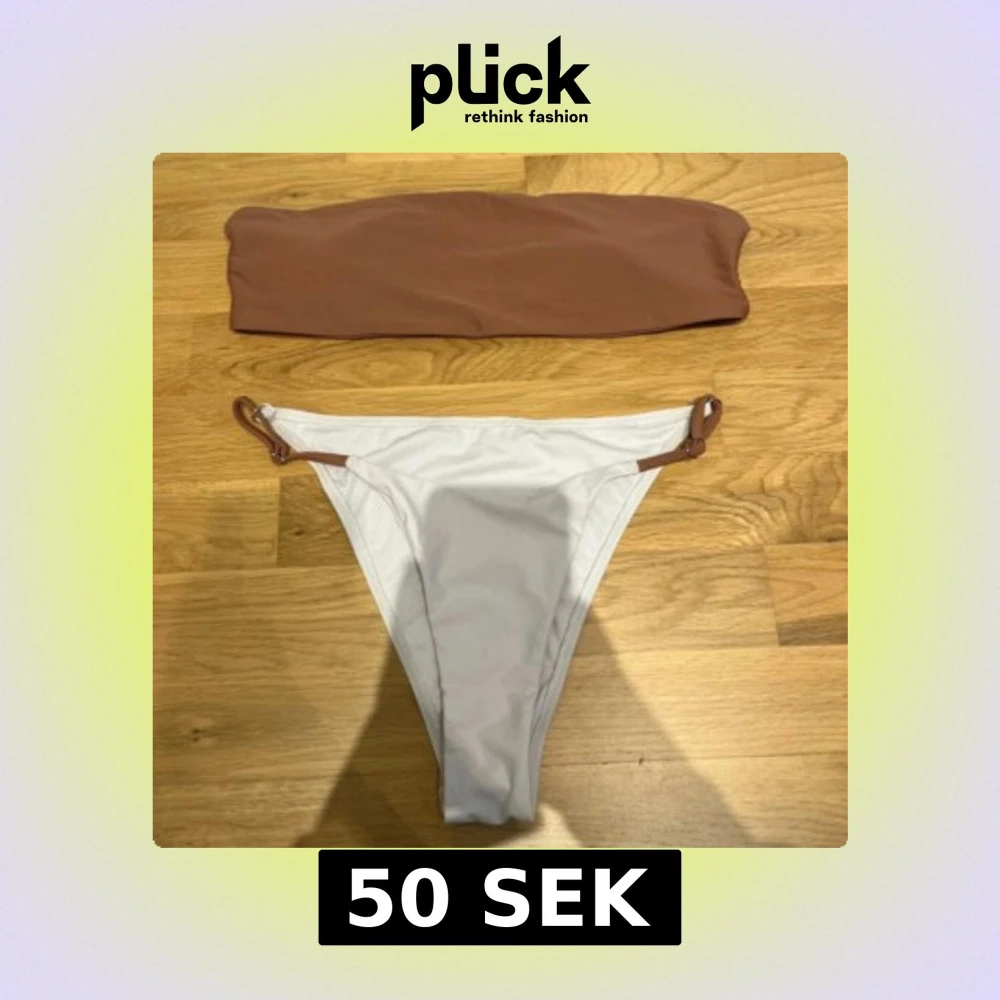 Säljer en snygg bikini med bandeau-topp i brun färg och högt skurna vita bikinitrosor med bruna detaljer och ringar i sidorna som man kan justera. Perfekt för stranden eller poolen!