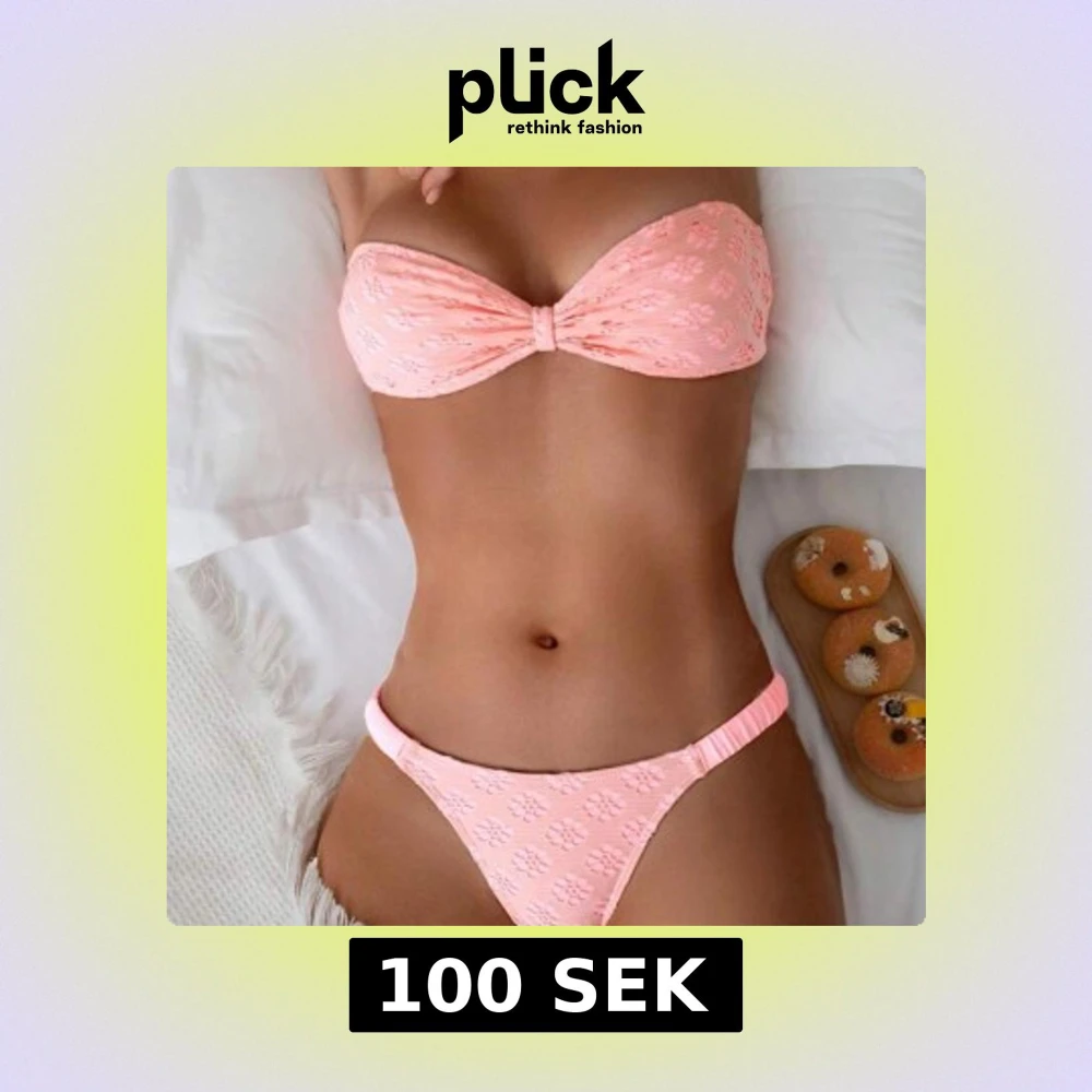 Superfin orange/neon bikini med bandeau-topp och matchande trosa. Bikinin har ett sött blommigt mönster och en liten knut framtill på toppen. Perfekt för stranden eller poolen i sommar!