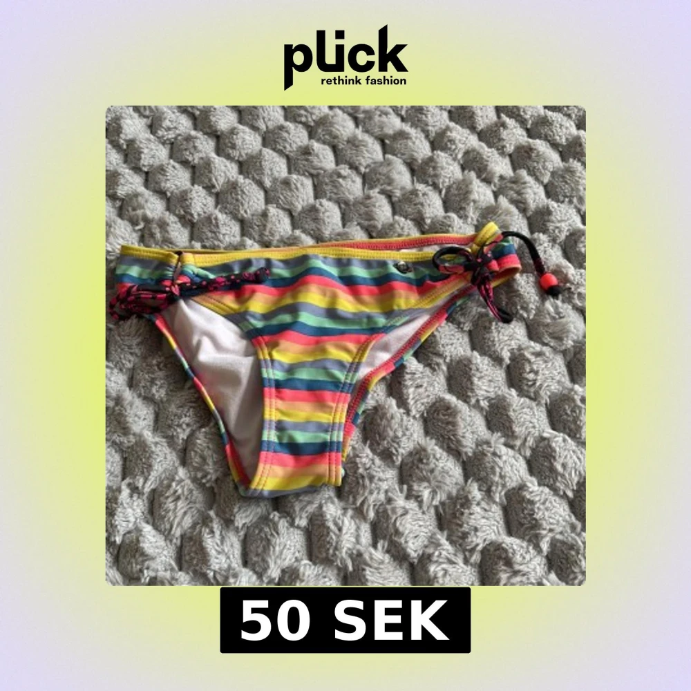 Färgglad bikiniunderdel från Protest med horisontella ränder i blått, gult, rosa, grönt och orange. Snygga knytband i sidorna med små detaljer. Tillverkad i stretchigt material som sitter skönt. Perfekt för strandhäng och poolparty.