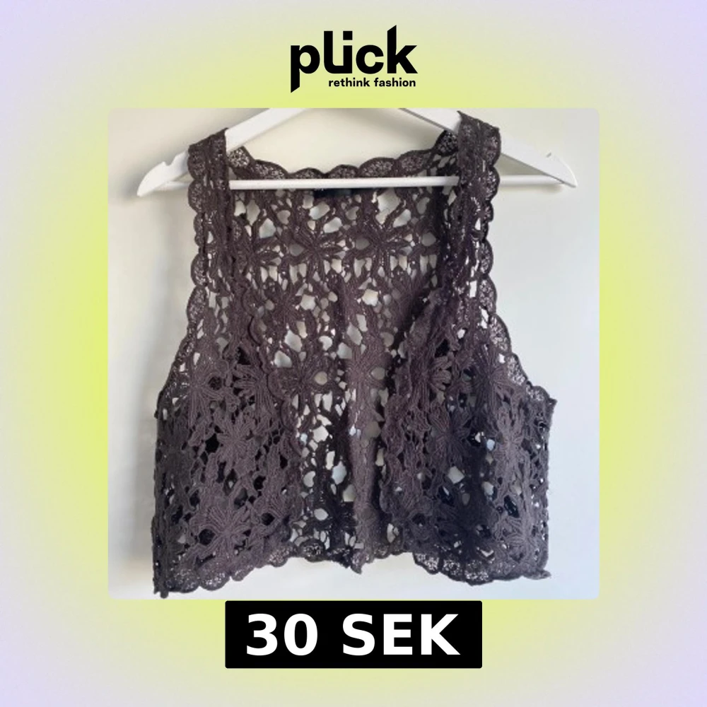 Säljer en grå/brun virkad väst med blommiga detaljer och öppen struktur. Västen har en kort, croppad passform och är perfekt för att ge en bohemisk touch till din outfit.
