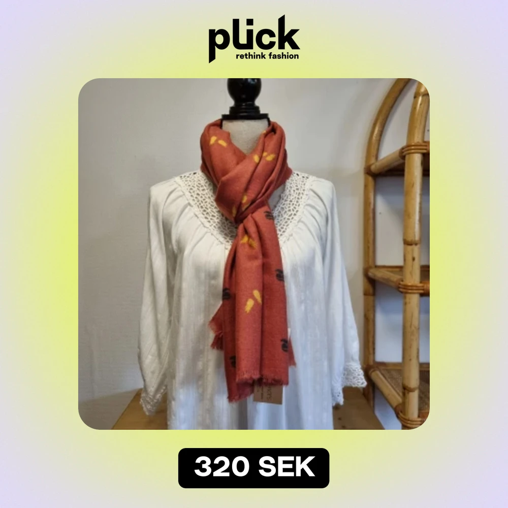 En rostfärgad halsduk med små mönster i svart och gult. Halsduken har fransar i ändarna och är tillverkad i ett mjukt material.