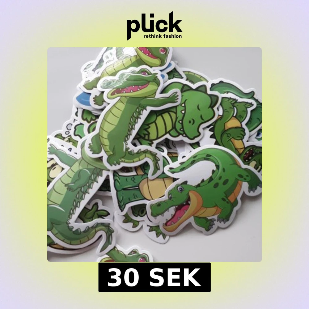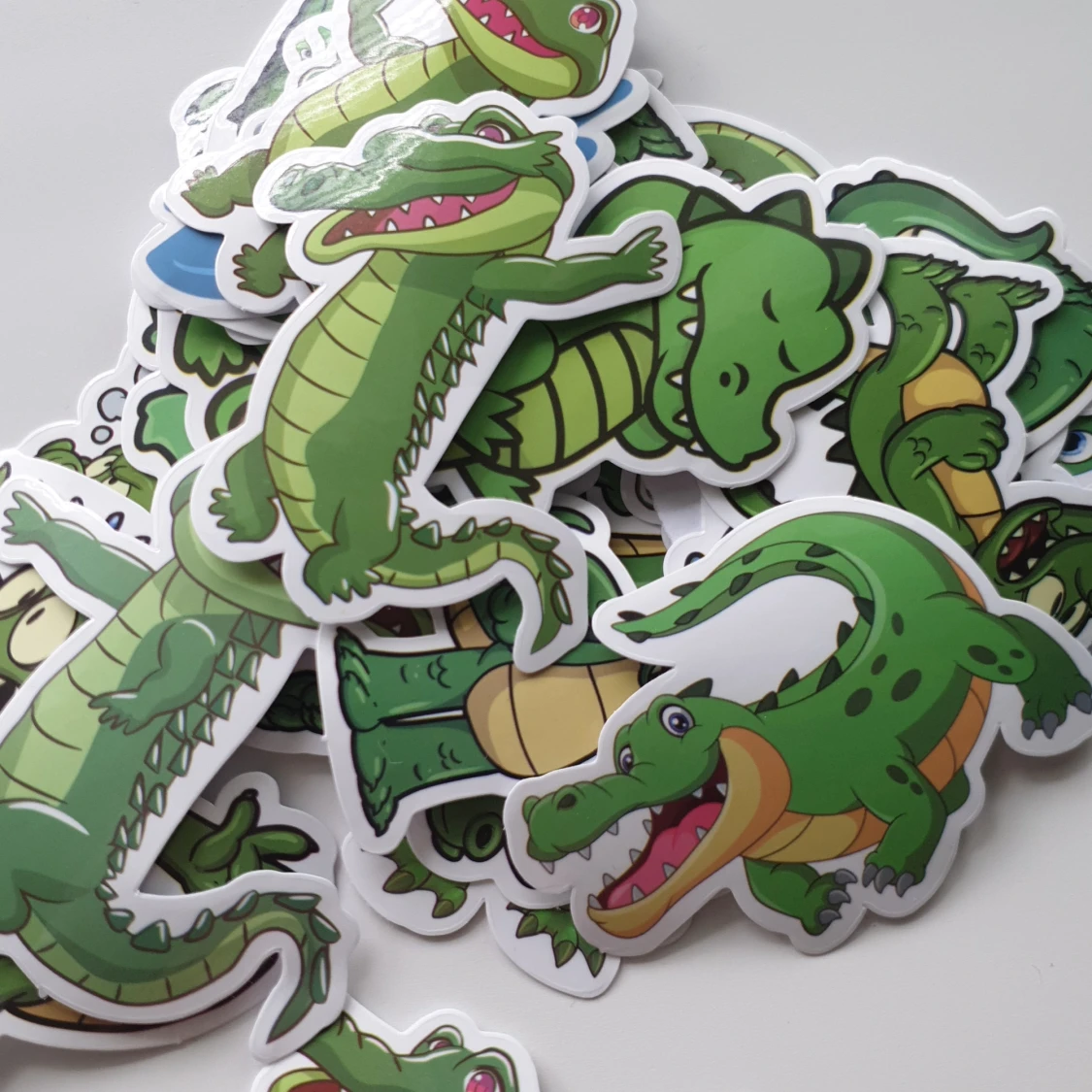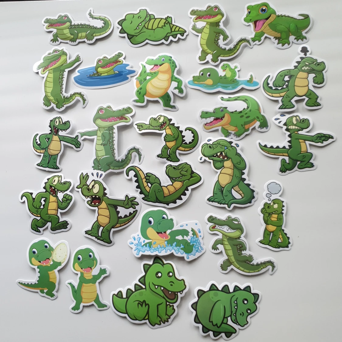 Ett set med färgglada klistermärken som föreställer olika tecknade krokodiler i gröna nyanser. Motiven visar krokodiler i olika poser och uttryck, vissa med accessoarer eller i vatten. Perfekt för att dekorera anteckningsböcker, laptops eller mobilskal.