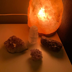 Tre råa ametist kluster i olika storlekar, med egenskaper vid bättre sömn. Ett selenit torn med egenskap att rena. Man betalar egen frakt.