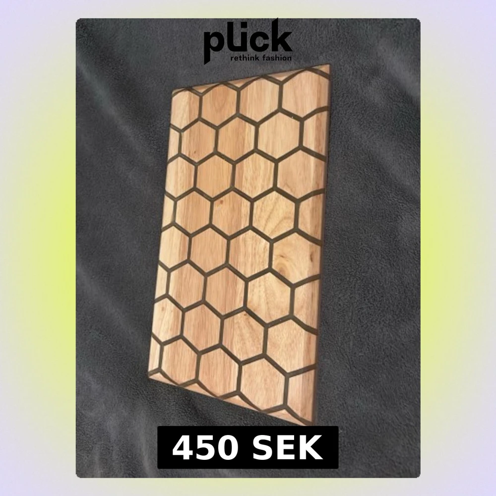 med ett coolt hexagonmönster på ena sidan. Brädan är i ljust trä och har svarta linjer som bildar ett bikakemönster. Perfekt som dekoration eller serveringsbräda och skärbräda man kan använda den till allt.