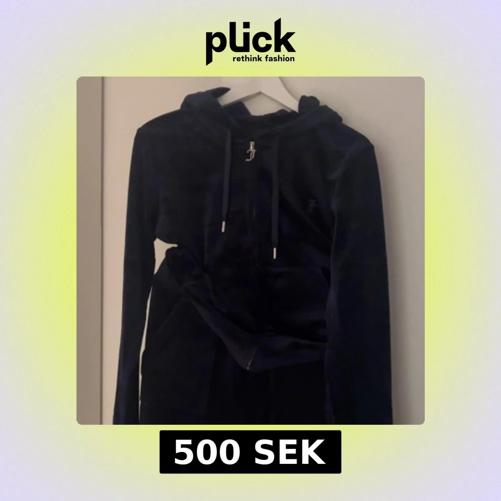 Mörkblått set från Juicy Couture i velour med dragkedja, huva och snörning. Logga på bröstet och snygga fickor med silverknappar framtill. Hoodie storlek M. Byxor storlek L. Väldigt fint skick! Båda delarna för 500 kr annars kan prisfisukteras vid köp av separat del!