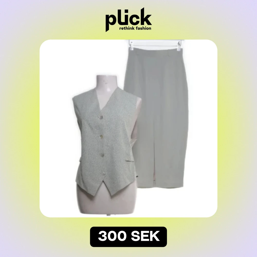 Mycket fint klassikt set för den moderna kvinnan. I en stilren design och i diskret färg av grå/grön i fiskben mönster. Överdelen är storlek 38 och underdelen stranden 36. Sparsamt andvänd. ACECAT är materialet