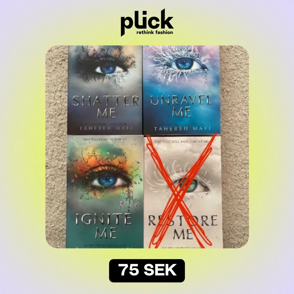 Tre första böckerna i shatter me serien. Super känd på TikTok. Superbra skick, ser helt nya ut fortfarande. 75kr styck, 200kr för alla tre🥂🙌