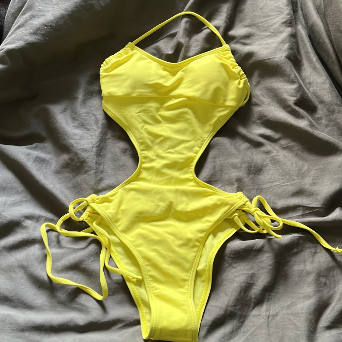 Helt oanvänd gul baddräkt med öppen rygg och utskärning vid magen - storlek S