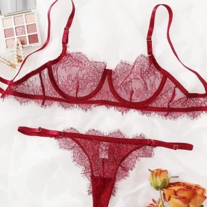 Super sött rött set som tyvärr inte passade mig): Ser ut exakt som på bilden🥰😍 Vid flera intresserande blir det budgivning!❤️ Kan gå ner i pris vid snabb affär😘 Skulle säga att det passar en 70A-B/75A-B då man kan ställa in storleken runtomkring ❤️ Trosorna är även justerbara